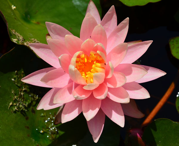 Die pfirsichfarbenen Seerosen sind immer ein besonderer Blickfang, besonders die größeren, die aus dem Teich farbkräftig leuchten, wie diese, oder auch die Sorte 'Sunny Pink'.